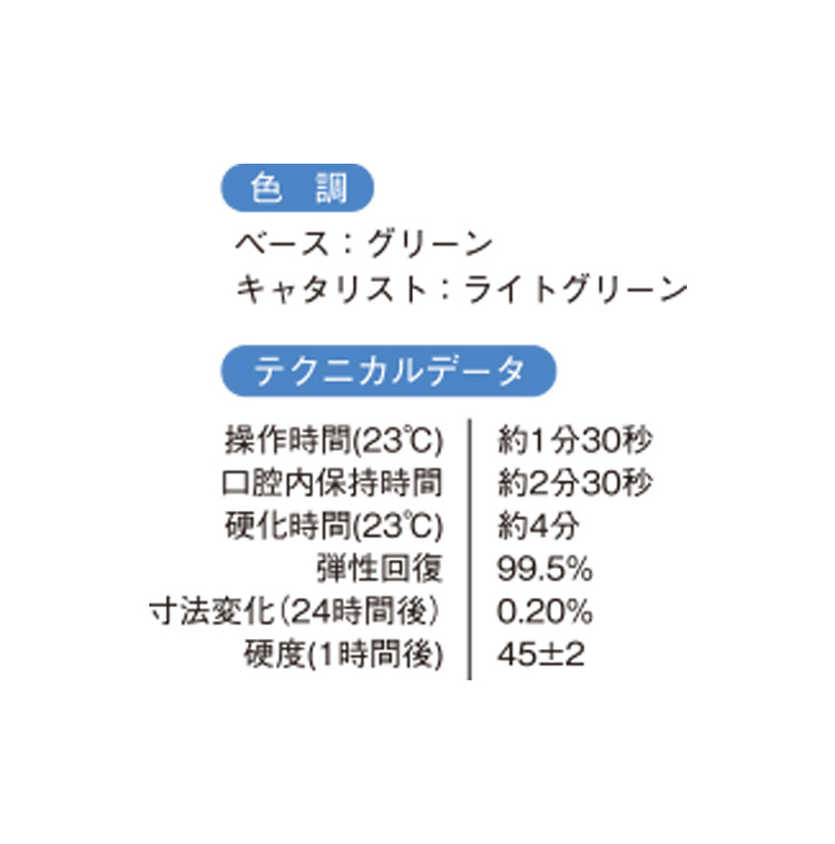 高い精度と操作性を兼ね備えた口腔内用付加型シリコーン印象材です。