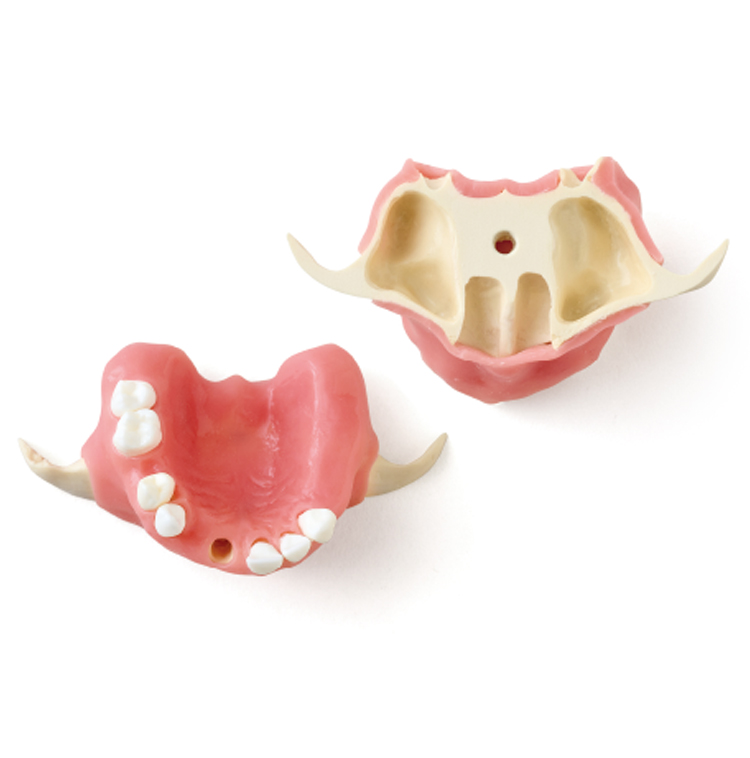 リアルな人工粘膜付きで、無歯区間、単歯欠損および遊離端欠損を含みます。