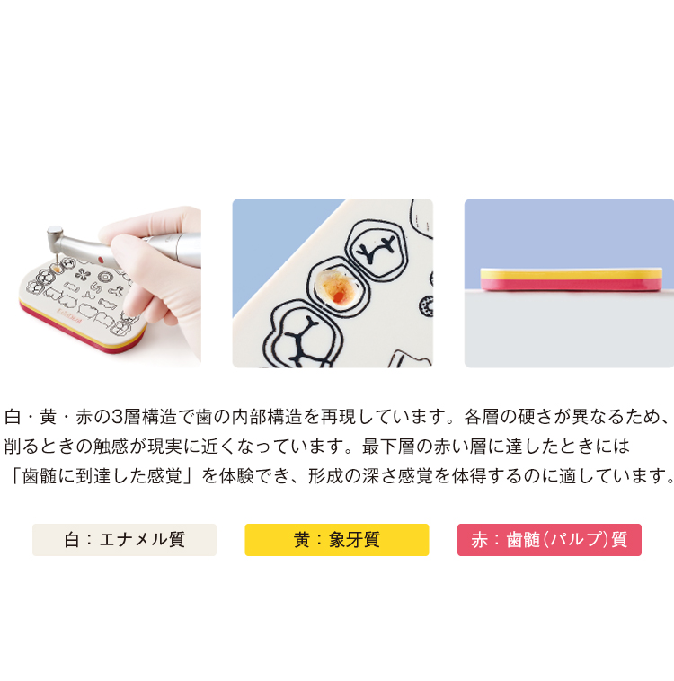 実際の感覚と視覚の両方で歯の構造と形成の練習ができるよう設計されており、歯科教育現場で非常に有用です。