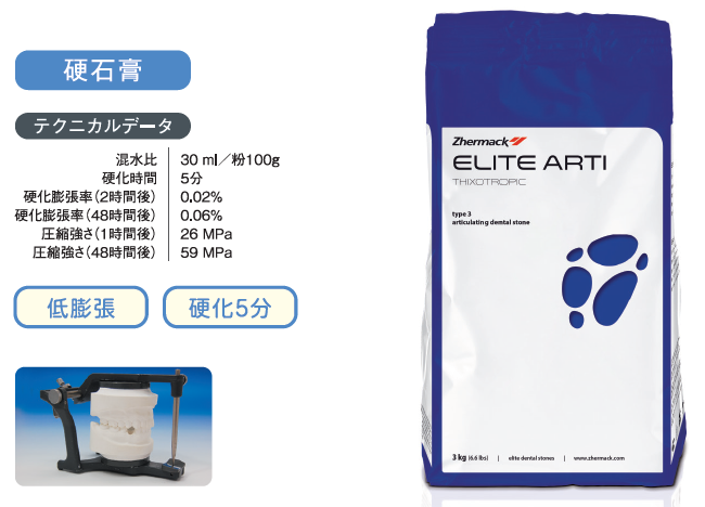 高い接着性で、膨張率が非常に低いため、咬合位置のズレを抑えます。また、チキソトロピーに優れ、咬合器のポジショニングが容易に行えます。