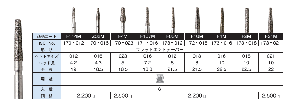| F10M | ミディアム フラットエンドテーパー | 表参照 | ー | 6本 |