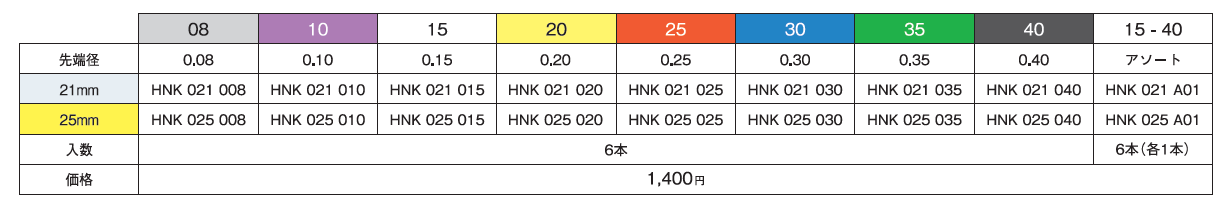 | 商品コード | 種類 | サイズ | カラー | 入数 |