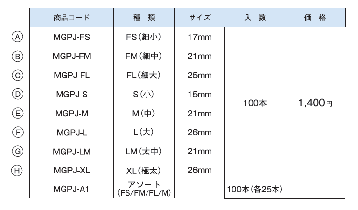 MGPJ-A1 アソート(FS/FM/FL/M) 100本(各25本)